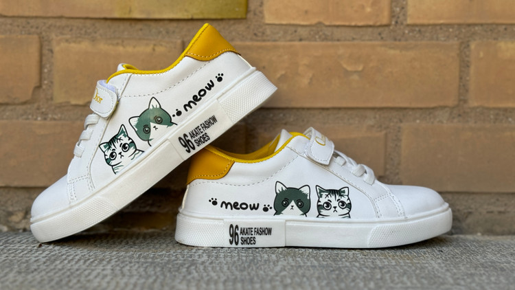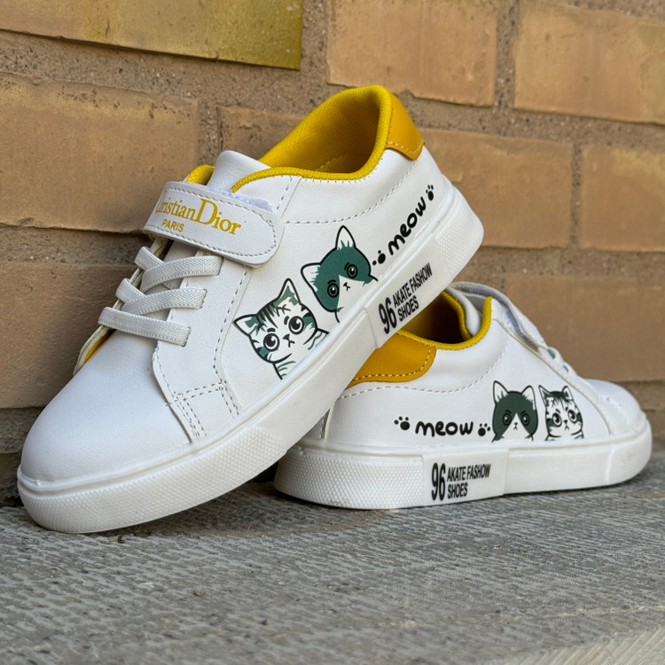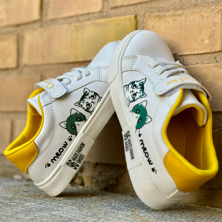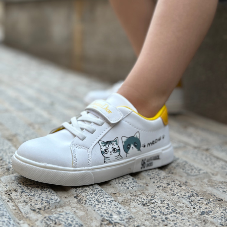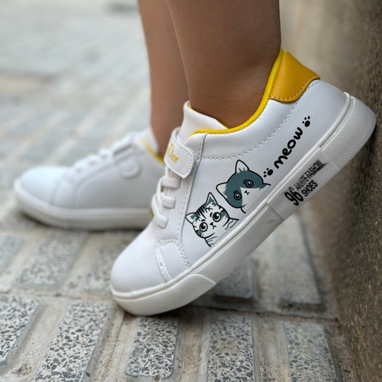 کفش اسپرت تک رنگ سفید و زرد طرح گربه ، چسبی و بند کشی برای راحتی فرزند دلبندتان